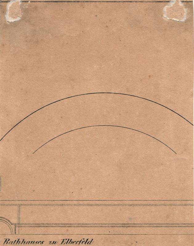 Verso d'un dessin. Ce fragment d'une gravure était mis à la disposition des participants au concours, a l'évidence pour indiquer les structures des murs à l'hôtel de ville de Elberfeld. Les lignes courbées en bas indiquent la position des fenêtres, respectivement des ornements correspondants d'un mur sans fenêtre. |