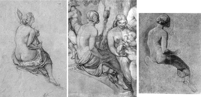| Mitte: Kartonausschnitt rechts: Verschollene Vorzeichnung, galt ehemals als Oswald Achenbach. Sie dürfte wohl von Josef Fay stammen. Allerdings bleibt die Frage nach dem Urheber der Komposition zunächst in der Schwebe, siehe z.B. einen Nachstich von 1858 nach Eduard Bendemanns Dekorationen des Dresdner Schlosses. |
