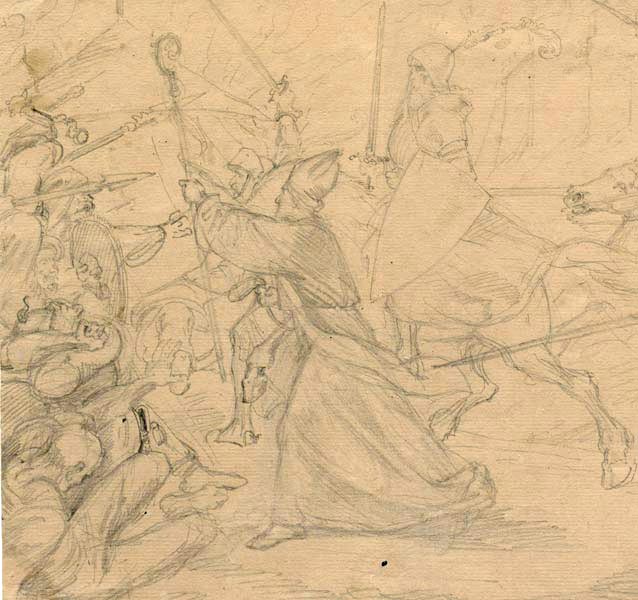 Dessin précoce (autour de 1832-33) de cet enfant prodige. Ici, Alfred Rethel trouve son inspiration dans les compositions de Carl Friedrich Lessing pour le château de Heltorf à Angermund (aujourd’hui part de la ville de Düsseldorf) – La bataille et la prise de Iconium (Konya en Turquie). |