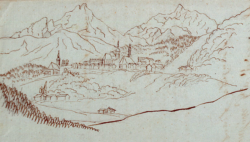 Um 1824-5. Berchtesgaden, Vorzeichnung zu einem Gemälde im Schloß zu Meiningen. Recht ungewöhnlich für Wagner und seine Romantikerfreunde ist der Gebrauch von blauem Papier, der sich folgendermaßen erklärt. Dies und die folgenden Reiseskizzen sind auf dem Verso eines mehrfach gefalteten Briefs, Quittung eines Fuhrunternehmers aus Peißenberg vom 19.Juli 1824. Er diente also als ein improvisiertes Mini-Reiseskizzenbuch.