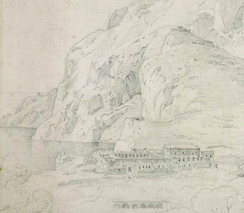 Ernst Fries, eher frührealistisch als romantisch. Nicht von ungefähr gilt nicht er, sondern sein Reisebegleiter August Kopisch als Entdecker der blauen Grotte. Ausschnitt eines sehr großformatigen Skizzenbuchblattes, hier eine Gesamtansicht. |