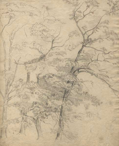 Attribué à Johann Anton Koch, le Nestor des peintres de paysage allemands à Rome. La stylisation est telle, que un ancien propriétaire a attribué le dessin à Carl Philipp Fohr, à l'époque éphémère collaborateur de Koch. |