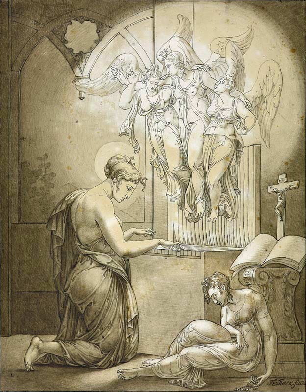 Christian Friedrich Tieck "Die heilige Caecilie" Ein bisher nicht gewürdigtes Hauptwerk der Frühromantik, dessen Entdeckung Stephan Seeliger verdankt wird. Blatt aus der Weimarer Zeit, spätestens 1804 (zur Ausstellung als terminus ante quem siehe unten). Damit gehört das Blatt zu den frühesten visuellen Äußerungen der jungen Bewegung, neben Werken von Caspar David Friedrich und Philipp Otto Runge. Grundsätzlich überrascht nicht, dass sich auch Tieck vom Jenaer Kreis der Frühromantik inspiriert fühlte, obwohl er wegen seines Spätwerkes als lupenreiner Klassizist gilt. Immerhin gehörte sein Bruder zum genannten Kreis. Auch darüber hinaus gehende Verbindungen waren nicht unbekannt; So hatte er zum Andenken an Wilhelm Wackenroder ein Medaillon modelliert. Hier in der Zeichnung geht allerdings nicht alles
