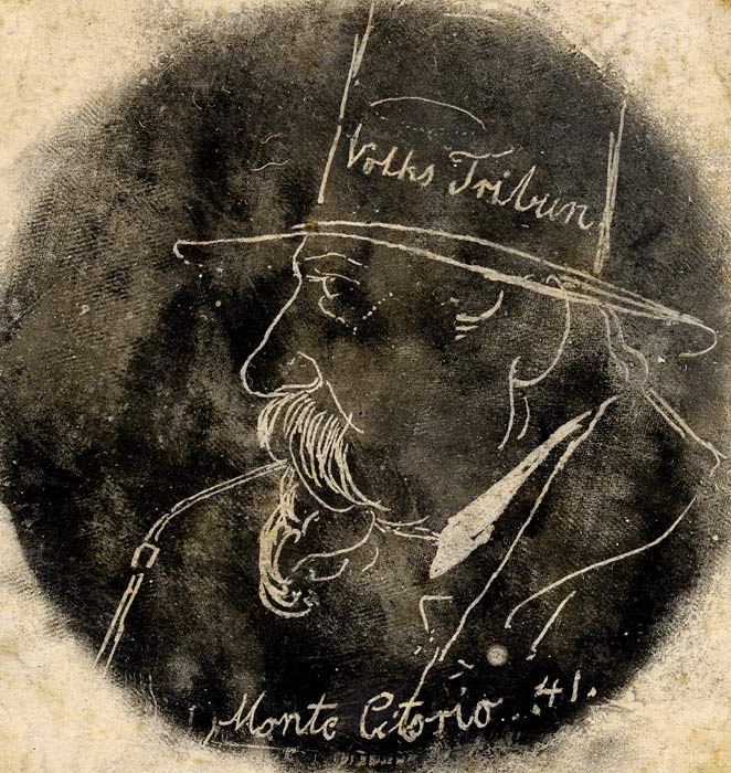 Carl Steffeck Monotype, un Volkstribun, membre du directorat de l'association des artistes allemands à Rome, la Ponte Molle-Gesellschaft, fait à Rome en 1841 au palais Fiano (ce lieu de rencontre de l'association était juste à coté du Palazzo Montecitorio). Le monotype est une technique exigeante, ne permettant pas de correction ou de retouche. Steffeck, dessinateur très doué selon le témoignage de son disciple, le plus célèbre, Max Liebermann, s'en servit sans doute pour faire impression auprès des confrères. Le monotype ou plutôt des procédés aux effets similaires n'étaient pas étrangers aux artistes berlinois: Benjamin Calau avait inventé la Calaugraphie (plutôt une sorte de grattage d'une couche colorée avec de la cire), les Rauchbilder (peinture à la fumée) de Karl Blechen étaient probablement parfois des véritables monotypes. |
