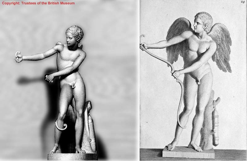 À gauche la copie Borghese (gravure publiée dans le Musée francais, tome IV, 1809), à droite la version du Capitol, gravure du Museo capitolino, tome III, 1743) |