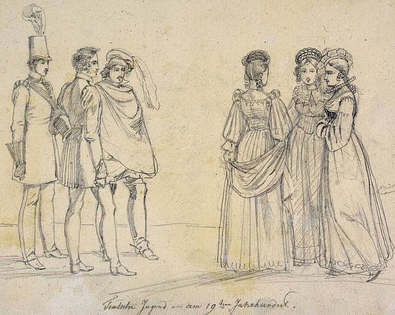 Ludwig Emil Grimm, Zeichnung wohl aus dem 2. Jahrzehnt. Laut eigenhändiger Aufschrift soll es "Teusche Jugend aus dem 19ten Jahrhundert " darstellen, die natürlich altertümlich gekleidet ist und damit keineswegs so "deutsch" ist wie es den Anschein hat.. | Ludwig Emil Grimm, porte une inscription autographe Teutsche Jugend aus dem 19ten Jahrhundert (Jeunesse allemande du 19ème). Cette mode n'est pas si allemande qu'elle n'en a l'air, voir ici. |