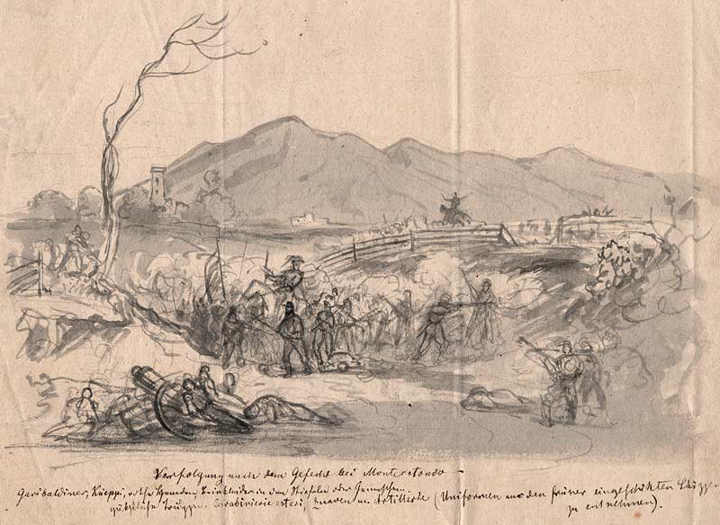 Zeichnung eines Kriegskorrespondenten während der italienischen Befreiungskriege unter Garibaldi, 1867. Die Zeichnung zeigt, wieviel Guys seiner Ausbildung als Pressezeichner verdankt. |