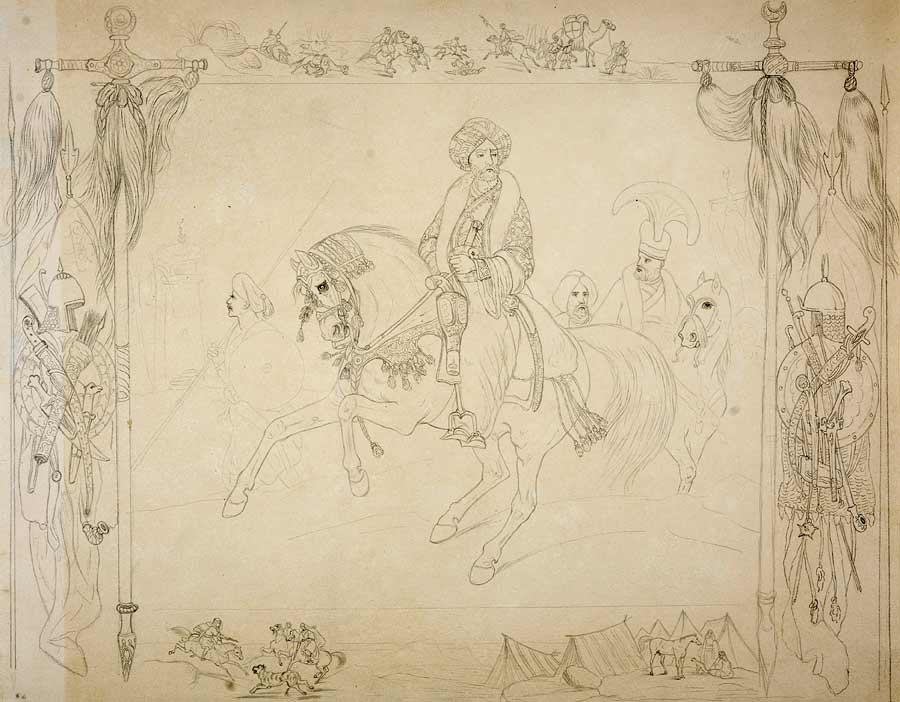 Attribué à tort à Horace Vernet, mais revient plutôt à Victor Adam, préparatoire à sa lithographie, avec le titre L'Asie mais qui représente sans aucun doute Abd el-Kader |