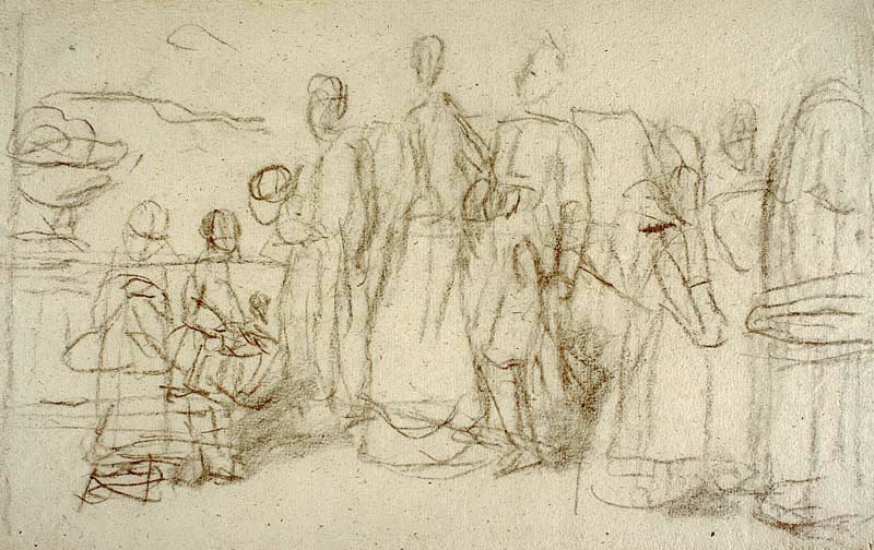 Les sœurs et frères de l’impératrice Elisabeth sur la terrasse du château de Possenhofen - cadeau de mariage de Louis I de Bavière à sa nièce Elisabeth d'Autriche. Fait rarissime chez Stieler: il y a plusieurs dessins préparatoires survivants qui montrent le soin avec lequel l'artiste a préparé les moindres détails. |