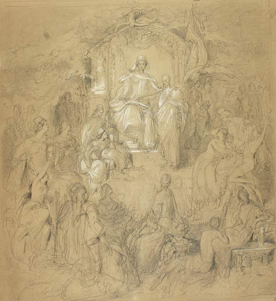 Un projet important de 1848 enfin retrouvé: L' Hommage à la régence de l' archiduc Jean (détail). Piloty entreprit un long voyage à Francfort et à Leipzig de au moins 1848 à 1850. La littérature en donne comme principale raison de "préparer un portrait du régent de la nouvelle fédération d'Allemagne, l'archiduc Jean d'Autriche, avec sa famille". Il s'agit plutôt d'un hommage allégorique à sa toute jeune régence, probablement une commande de la Bavière. La feuille avait été considérée comme une allégorie de la ville de Munich. L'identification correcte se fait grâce à l'esquisse d'un portrait de l'archiduc en marge du dessin. Il y a malgré tout un grain de vérité dans l'ancien titre