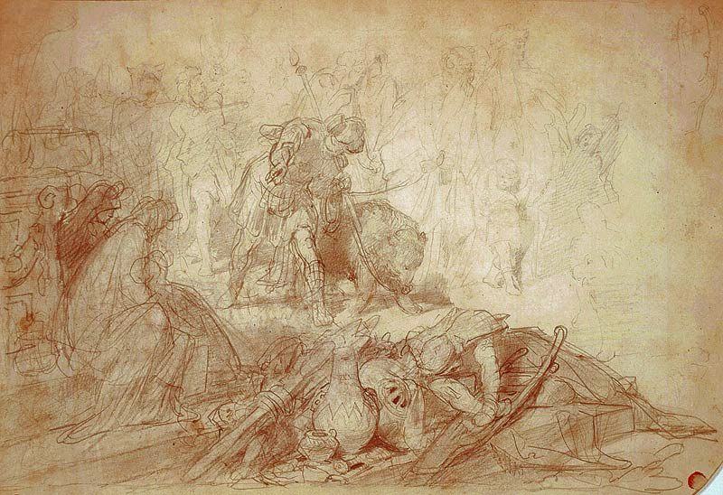 Skizze (verworfene Variante für die Vordergrundgruppe) für das Gemälde "Thusnelda im Triumphzug des Germanicus" in der Neuen Pinakothek, München. Um 1860-70, ausgestellt auf der Weltausstellung in Wien 1873. |