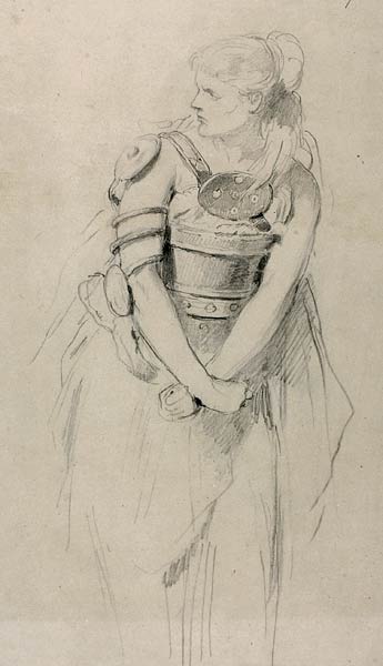 Vorzeichnung für eine Begleiterin der Thusnelda. Ein solcher Transfer eines Kleidungs- bzw. Rüstungsdetails von einer Frau zu einem Mann ist unhistorisch (freundlicher Hinweis Sven Schütte), was auch Piloty nicht unbekannt gewesen sein kann, und ohne gewichtige Gründe kaum vorstellbar. Hier tun sich Abgründe hinsichtlich eines egalitären Rollenverständnis der Geschlechter bei den Germanen auf - in Pilotys Augen. Damit wäre der Kontrast zu den Römern auch auf dieser Ebene weiter akzentuiert. Nicht nur hinsichtlich der Dekadenz der Römer im Vergleich zur Frische der Germanen. Im Ölgemälde ist dann doch alles wieder bei den Konventionen: Auch die Germanin ist unbewaffnet. |