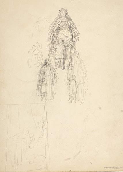 Probablement une étude précoce pour le groupe de Thusnelda et son fils (au verso se trouve une esquisse pour l'édition de poèmes de Schiller de 1859, Semele). Piloty y cherche encore la position finale, la tête légèrement tournée vers la droite. |