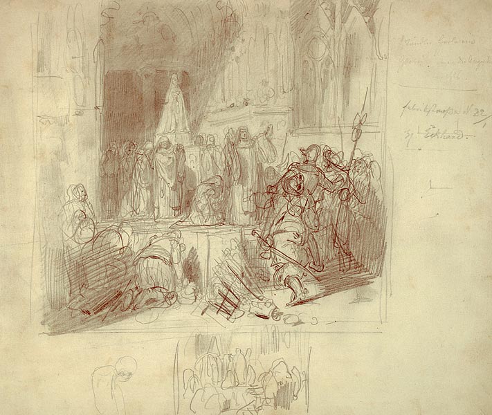 Die Äbtissin von Frauenchiemsee verteidigt ihr Kloster gegen Soldaten, um 1855. 1868 gilt als Entstehung des Ölbildes - Diese Zeichnung bestätigt von Böttichers Angaben, dass das Bild auf einer "wol zwölf Jahr ältern Zeichnung" beruhe. Auf dem Verso (siehe folgendes Blatt) ist nämlich eine Variante einer Skizze auf der Entwurfszeichnung zu "Seni und Wallenstein", also um 1855. Piloty hat gelegentlich über einem Stoff viele Jahre meditiert, bevor er sich zu einer öffentlichen Fassung entschieden hat. |