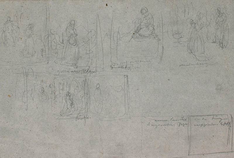 Folge von Entwürfen bisher ungeklärten Zweckes, anscheinend mit Pilotys Lieblingsstoff "Tod", jedenfalls u.a.ein Kirchhofsbesuch.