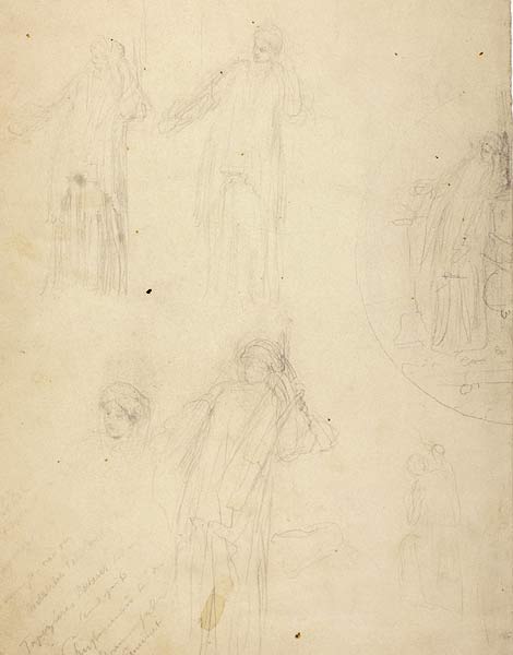 Mehrere Skizzen für eine weitere Illustration zur Ausgabe von Schillers Gedichten 1859: Semele. Piloty hat an eine Komposition im Rund gedacht, diese jedoch nur in der ersten Ausgabe umgesetzt. |