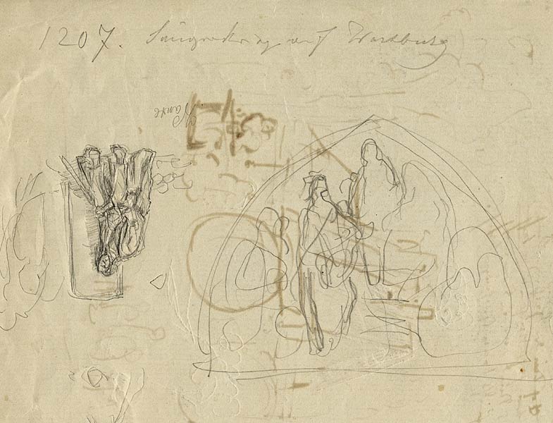Première esquisse pour le Tournoi des chanteurs, peinture sur la façade du Maximilianeum à Munich, datée 1858. |