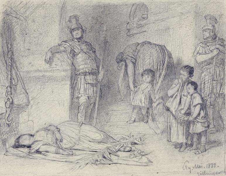Au moment de ce dessin tardif, Piloty hésite encore entre plusieurs versions