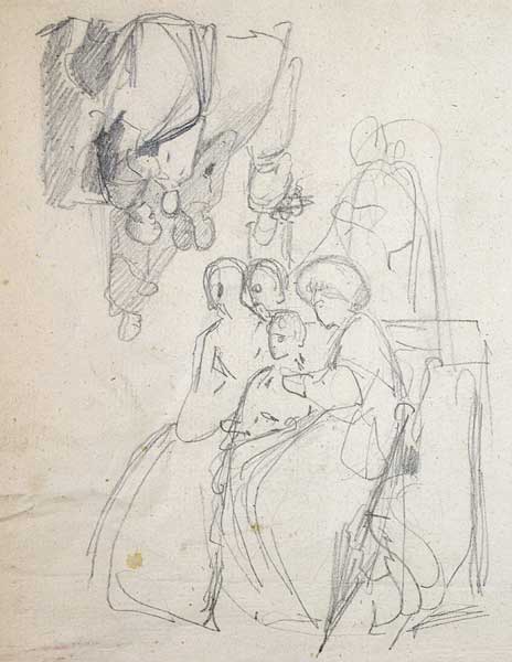 Hermann Kaulbach, Vorzeichnung für "Die Kinderbeichte". das Blatt ist ganz im Stil seines Meisters Piloty, der ihm im Übrigen selbst mit einigen Studien zu diesem Projekt geholfen hatte (siehe unter Kaulbach-Nachlass auf diesen Seiten). Als weiteres Zeichen ihres freundschaftlichen Umgangs gibt es ein gegenseitiges Portrait beider Künstler von einer Reise Ende der 60er Jahre nach Oberitalien. |