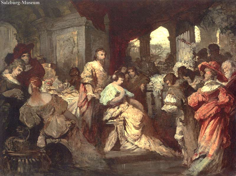 Un festin. Peinture au musée de Salzburg, date, proposé par Gerbert Frodl, autour de 1870. Il propose également d'y voir une première idée du grand succès de Makart, la Caterina Cornaro. Les costumes ne s'y accordent pas du tout. Cela ne serait pas étonnant de la part de Makart. Il ne se soucia guère de ce genre de détails, primordial seulement pour un peintre d'histoire. |