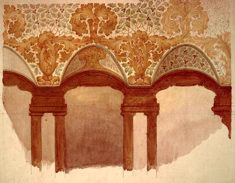 Projet de décoration pour la salle de concert à la Villa Heyer, ancien Musée de la Musique à Cologne. La collection était déjà disparue en 1926. Le bâtiment, joyau de l'art nouveau, est "conservé", en fait transformé en hôtel. La grande salle de spectacle est fragmentée et convertie en chambres d'hôtel. Il ne subsiste plus rien de l'ancienne décoration. |