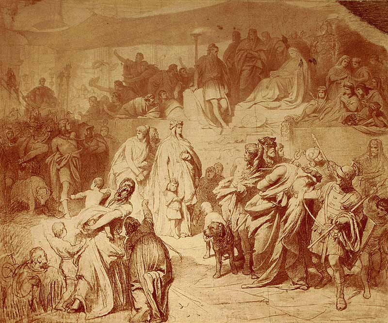 Wie Kaulbach hat sich Karl Theodor von Piloty der Fotographie bedient. Hier ein Foto nach dem Karton zur Thusnelda, heute in der Neuen Pinakothek in München. Das Foto stammt aus Pilotys Nachlass, rückseitig war eine Detailstudie zur Komposition aufgeklebt. |