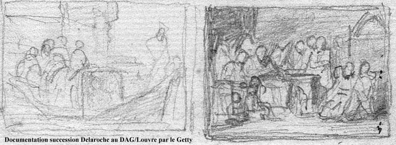 Ein erstes solches Pärchen (noch mit konventionellen Proportionen) ist auf einer Zeichnung in einer Privatsammlung überliefert. Man könnte denken, dass es sich rechts um eine Skizze zum "Mazarin" handelt. Tatsächlich zeigt eine weiter ausgearbeitet Fassung ein Motiv aus der Renaissance, wohl "Thomas Morus im Kreis seiner Familie". | Dans son abréviation, on pourrait prendre l'esquisse à droite pour une première idée de Mazarin: Deux dessins plus élaborés permettent de nous orienter dans un autre sens: l'un au Louvre, l'autre autrefois chez les héritiers de l'artiste. Il s'agit très probablement de Thomas More lisant la bible au sein de sa famille. |