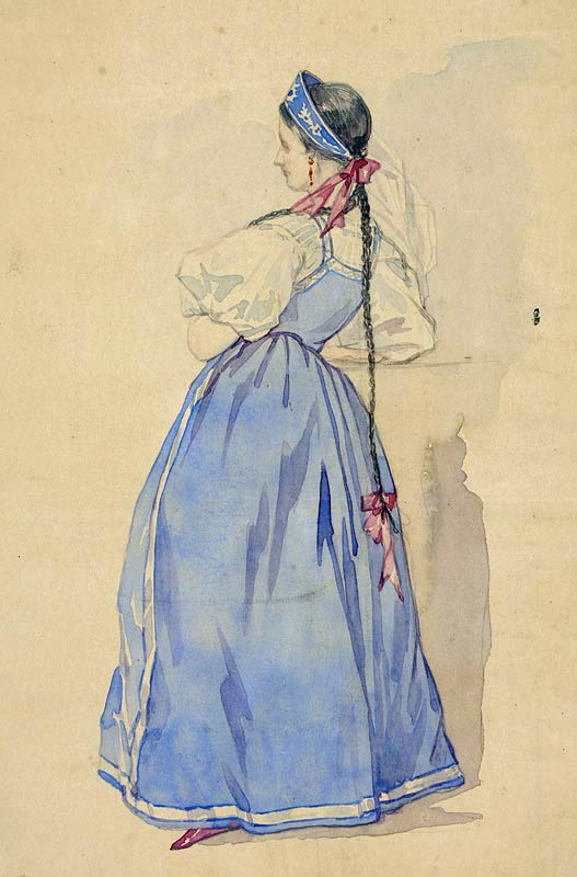 Bal masqué à Nice À l'apparence un dessin de genre, pas vraiment le type de dessin préfèré de Delaroche. Effectivement, cette aquarelle faite à Nice en 1852 ne représente pas une paysanne de la région. Elle est plutôt une référence tardive aux plaisirs du théâtre et du déguisement. Autour de 1829, Paul Delaroche avait fait un portrait-charge de l'ami Eugène Lami exactement dans le même costume et dans la même position dans lesquels Lami lui-même avait peu de temps auparavant dessiné un participant au Quadrille de Marie Stuart, fameux bal masqué donné par la duchesse de Berry en 1829. Lami avait lithographié un album avec tous les participants au bal d'après ses propres dessins. Ici, la clef de l'identification se trouve dans le vêtement. Delaroche a dessiné la jeune femme en habit russe; probablement aussi le souvenir d'un bal masqué, cette fois-ci organisé par ses amies et voisines à Nice, les sœurs Ludmilla et Delfina Komar, originaires d'une région alors annexée à la Pologne, mais de l'actuelle Ukraine (l'une par mariage princesse Beauvau-Craon, l'autre comtesse Potocka). Il existe un dessin d'esprit similaire de 1850, également fait à Nice, offert en 2005 par la galerie newyorkaise Shepherd: un garçon, selon l'inscription autographe de l'artiste déguisé en Marquise. Vers un bel article par Jean-Paul Potron sur le séjour de Paul Delaroche à Nice. |