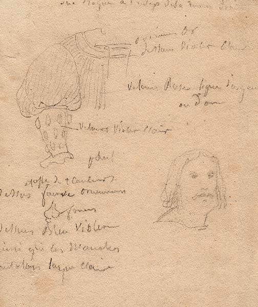 Nach einem bislang nicht identifizierten Gemälde, das die Mode am Übergang des ersten zum zweiten Viertel des 16. Jahrhunderts wiedergibt. Es scheint, dass einige Merkmale in der Kleidung von Leonardo da Vinci und von Raffael in der ersten Ölskizze für die Wandmalerei in der Kunstakademie verwendet worden wären. |
