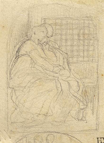 À partir de 1836, l’année de son „Strafford“ (Lord Strafford allant au supplice demande la bénédiction de Laud, archevêque de Cantorbéry, enfermé au prison du Tower de Londres), le thème du prison revient à plusieurs occasions. Il y a une certaine ambiguïté quant à la fonction des barreaux – protecteurs ou vraiment privant de la liberté? Carl Vogel von Vogelstein créa une peinture de la« Martyre Perpétua au prison » - composition très similaire - pendant son deuxième voyage en Italie de 1842 à 1844. Les deux artistes se sont rencontrés à Rome où Delaroche fit le portrait de Vogel von Vogelstein. |