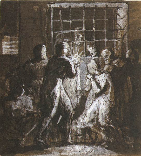 Dieses Blatt aus einer Privatsammlung war im Katalog der Schnetzausstellung in Flers 2008-2009 als Vorarbeit zum Boetius aufgeführt, dürfte sich aber eher auf eine andere, vielleicht religiöse Begebenheit beziehen - während Schnetz und Delaroches Zeit in Rom? |