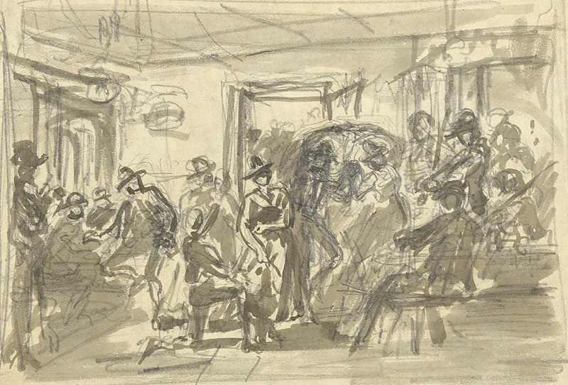 Schuhplattler, ein eher klassisches Motiv der Münchner Kunst. Es erinnert sicher nicht zufällig an Franz Defregger, der gleichzeitig mit Schweitzer, am 27.4.1861, an der Akademie zugelassen wurde. | Danse populaire dans une auberge des Préalpes bavaroises. Elle rappelle l'art de Franz Defregger, admis le même jour que Cajetan Schweitzer à l'académie. |
