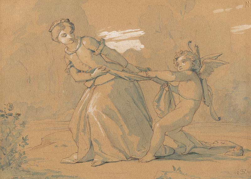 Wurzbach (Eduard Steinle - Ein Madonnenmaler) erwähnt ein Widmungsblatt aus den 40er Jahren auf die Ehe mit einer Anspielung auf die Verlobungszeit, die Steinles Braut in Heiligenstadt zugebracht hatte. Dieser "Heiligenstädter Amor" wird dem Vorliegenden geähnelt haben. | Allégorie de l'amour - selon Wurzbach (dans Österreichisches Kuenstlerlexikon) Steinle a rendu hommage à l'amour conjugale sous forme d'une allusion à ses propres fiançailles. Cette feuille disparue devrait avoir eu une apparence semblable. |