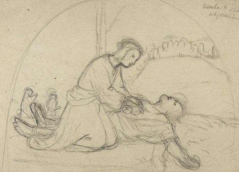 Nachlassstempel. Die Komposition ist festgelegt. Änderungen zur finalen Fassung sind nur noch marginal (Korrektur der Armhaltung - hier noch wie beim Gekreuzigten. Drehung des Kopfes ins verlorene Profil - notwendige Folge der Position des Samariters vor dem Verletzten). |
