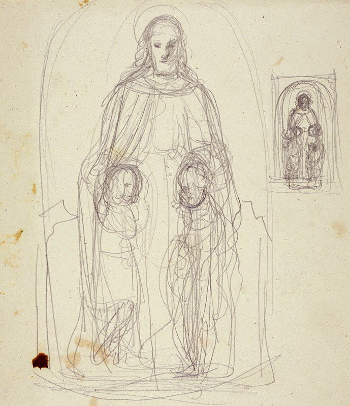 bzw. Guter Hirte. Die grobe skizzenhafte Zeichenweise spricht für eine frühe Entstehung. Verwandte Darstellungen finden sich in der Arabeske, die Steinle um Overbecks Fresko in der Porziuncola in Assisi gestaltet hat. |