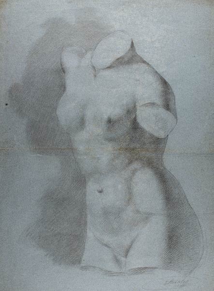Dessin très précoce, d'après l'antique (ou plutôt une imitation en plâtre) du temps des cours à l'académie de Vienne. Le rendu du corps ressemble à s'y méprendre à l'étude précédente. Au lieu d'étudier le nu, Steinle a sans doute parfois eu recours à son carnet académique.. |