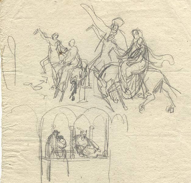 Laut Inventarisierung des Nachlasses "Brentano, Radlauf", ein Thema, mit dem sich Kaulbach in den 30er Jahren beschäftigt hat. Hans Müller, Kaulbach, Berlin 1893, präzisiert, dass hier eine Skizze zur zweiten Szene einer Serie von sechs vorliegt, Radlauf und Ameleya erreichen die Königsburg in Mainz |