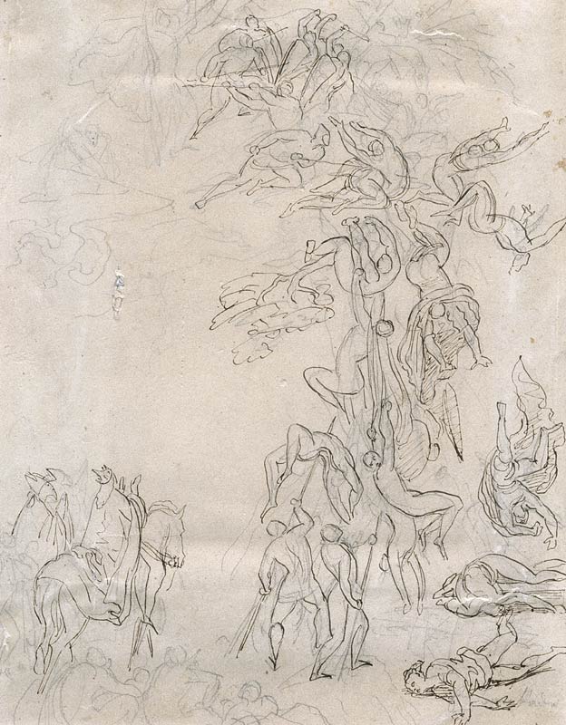 Anscheinend Szene eines grausamen Gemetzels. Auf vielen Blättern Kaulbachs ist es schwer, karikaturhafte Übertreibung, Ernst und spielerisches Treiben des Zeichenstifts auseinanderzuhalten. Kaulbach Briefe an die Familie aus Berlin, wo er etwa 20 Jahre an den Wandmalereien im Museum arbeitet, sind voll solcher mehrdeutiger Marginalien. |