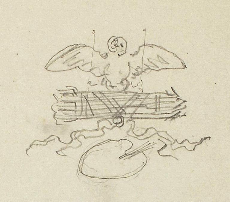 Hier eine Eule über Malerpalette und mit je einer Kerze in beiden Klauen. Offensichtlich also frühe Planung, da in der endgültigen Version die Eule der Wissenschaft, nicht der Kunst zugeordnet wurde. | La chouette avec des bougies sur une palette de peintre, détail de la feuille. À l'évidence à situer très tôt dans le développement de l'idée. Plus tard, la chouette finit comme symbole de la science. |