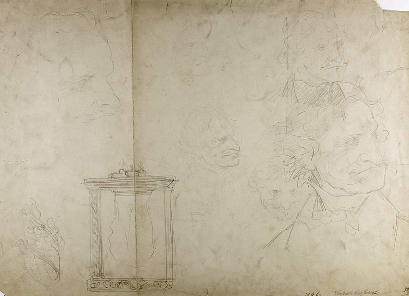 Kaulbach war mutig bis zur Selbstzerstörung, entsprechend gefürchtet waren seine teils karikaturhaften Darstellungen - übrigens auch im Selbstportrait. Selbst in dieser Studie für ein Monumentalgemälde König Ludwig I, seines nach A. Raczynski wichtigsten Mäzens, wagt er eine realistische Darstellung des greisen Monarchen mit eingefallenem zahnlosem Mund. Sie variiert auf diesem einen Blatt vom Lüstern-Satyrhaften bis zu einer gewissen Altersweisheit. |