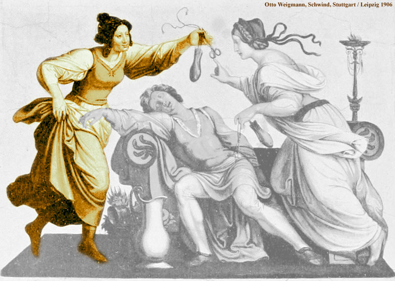 Vieille photographie de la fresque, perdue pendant la deuxième guerre mondiale. Comme dans d'autres couples dessin/fresque chez Schwind, il a modifié son étude dans la fresque. |