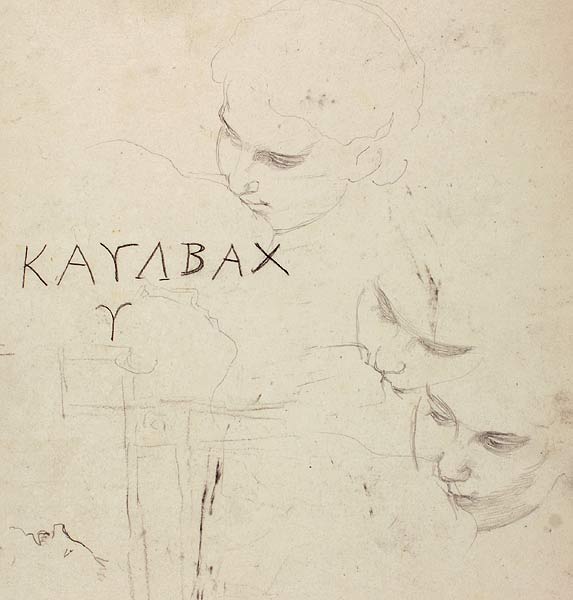 Non seulement le nom de l'artiste écrit en lettres grecques nous renvoie vers la décoration de la chambre à coucher de la reine. En vue de son Alexis et Dora, allégorie de l'amour d'après un poème de Goethe (un autre dessin de ce sujet fut signé de la même manière). |
