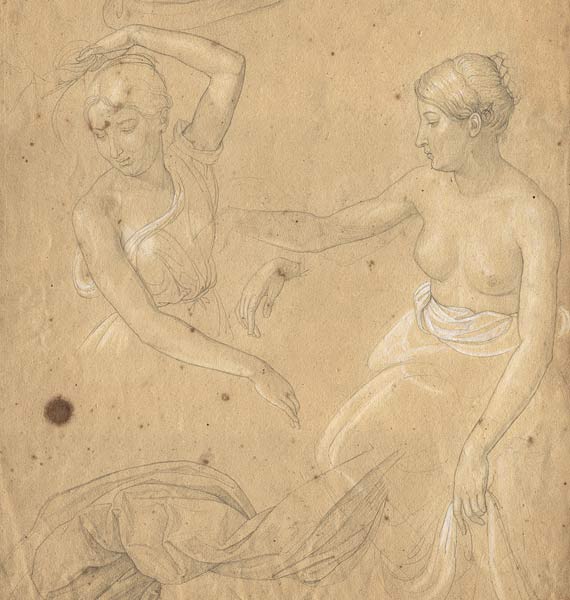Für Musen im Parnass im Odeon, vor 1828. Ein anderes Blatt in gleicher Technik (siehe vorhergehendes Blatt) ist teils im Zusammenhang der Cid-Zeichnung von 1824 geplant. Für die Münchner Entstehung dieses Blattes spricht allein die frappierende Ähnlichkeit mit seiner zukünftigen Ehefrau Josefine Suttner, mit der er sich 1826 heimlich verlobt. Verso eine Studie für den Faltenwurf der linken Figur im Parnass. |