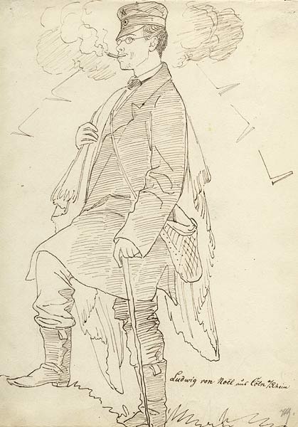 Ludwig von Noël aus Cöln/Rhein (inscription autographe). La relation avec ce personnage reste encore à déterminer. Une von Noel de Bonn était propriétaire d'une œuvre de jeunesse de Kaulbach, la relation date donc peut-être des années passées à Düsseldorf et en Rhénanie. De l'autre coté, ce personnage était très probablement un camarade d'université du fils Kaulbach, Hermann, voir page suivante. |