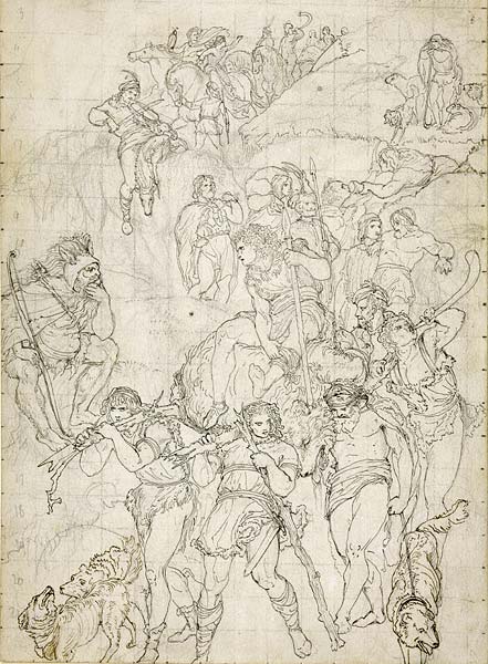 Rare (unique ?) dessin de Kaulbach à être mis au carreau. Très probablement partie du projet autour de Charlemagne et les Saxes. Ici, les Saxes vont à la chasse de l'ours. Le dessin provient d'un carnet de dessin dans lequel se trouvent d'autres esquisses pour la composition, mais également pour les illustration à Shakespeare, donc à daté vers 1853-1860 (Bayerische Staatsbibliothek, Munich: Kaulbach-Archiv VIII.5). |