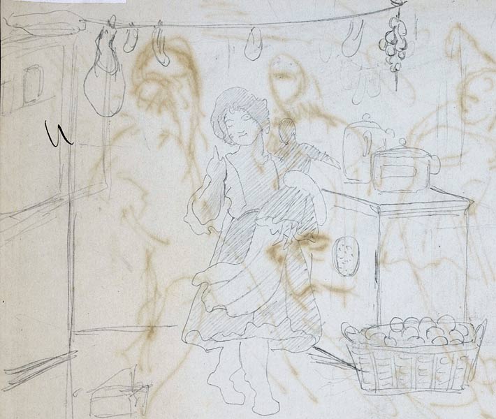 typische Karikaturzeichnung von Wilhelm von Kaulbach, wahrscheinlich eine der Töchter